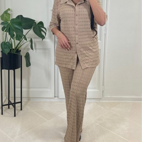 Cet élégant ensemble se compose d’un pantalon droit et d’un haut à nouer à la taille. Les détails sur les manches apportent une touche d’originalité à la tenue. Cet ensemble est à la fois chic et décontracté. Il est parfait pour aller travailler.