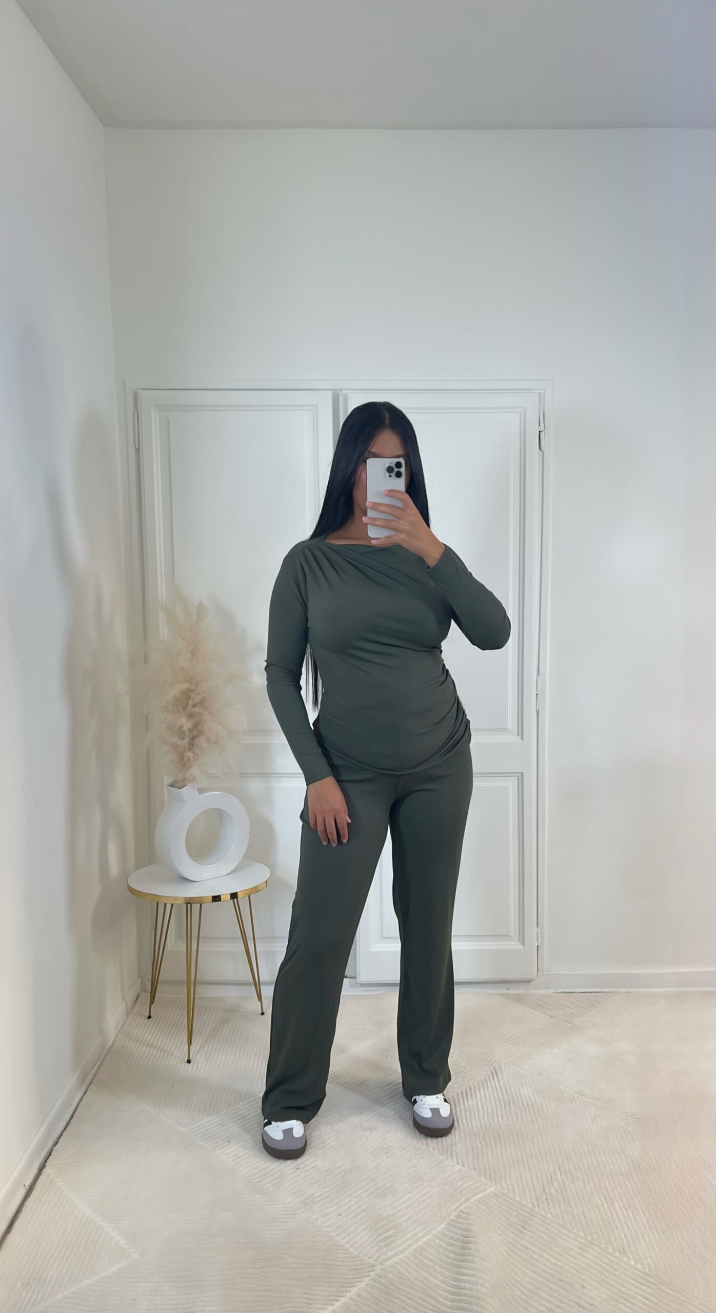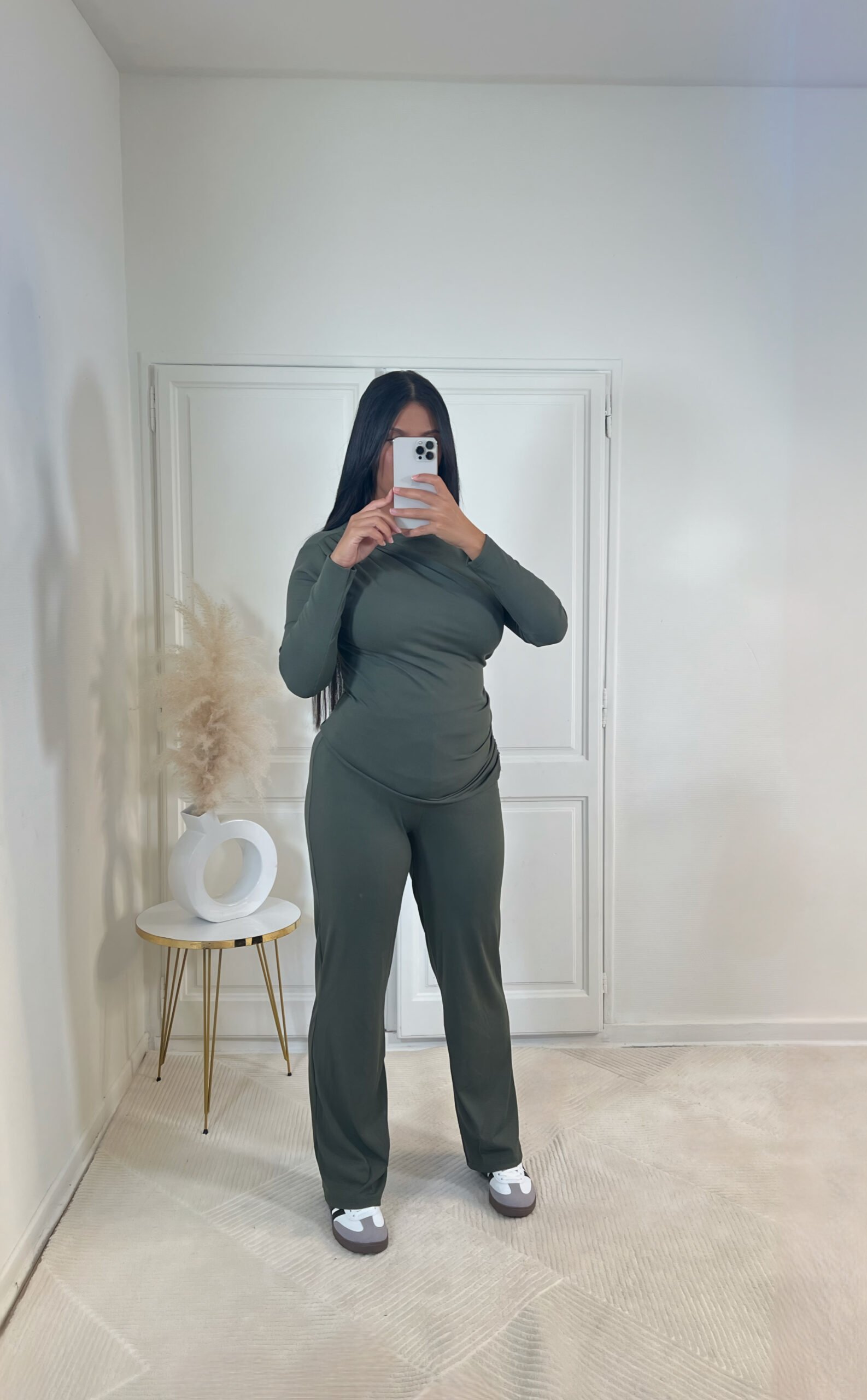 Ensemble haut à coupe asymétrique, offrant un confort exceptionnel, disponible en noir, kaki et beige.